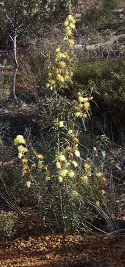Banksia acanthopoda is a species of shrub in the family Proteaceae. It grows as a small spreading shrub to 2 m (6+1⁄2 ft) high and has prickly leaves and yellow composite flower heads, called inflorescences, composed of 50 to 60 individual yellow flowers. Flowering takes place in the southern hemisphere winter. Endemic to Western Australia, it occurs only in a few populations in the vicinities of Woodanilling, Katanning and Darkan. Because of its rarity, it is classed as "Priority Two" conservation flora by Western Australia's Department of Environment and Conservation.