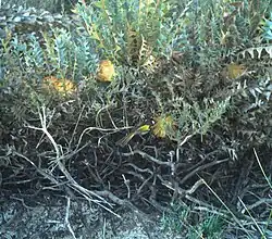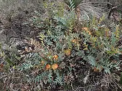 This banksia grows on breakaways in kwongan on the Gairdner Range and north of Badgingarra in the Geraldton Sandplains biogeographic region.[3][4]
