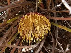 Banksia comosa, commonly known as Wongan dryandra,[2] is a species of shrub that is endemic to Western Australia. It has linear leaves with widely spaced, sharply pointed serrations, heads of yellow flowers and glabrous fruit.