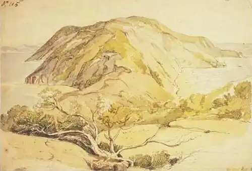 The next known collection was in December 1801, during the visit of HMS Investigator to King George Sound. Little is known of the circumstances of this collection, other than what is written on the specimen label: "King Georges Sound Dec[embe]r 1801".[8] The specimen is credited to Robert Brown, but gardener Peter Good and the botanical artist Ferdinand Bauer also contributed to Brown's specimen collection, often without attribution.[9] A more precise date and location cannot be given, as neither Brown nor Good mentions the collection in his diary.[10][11] Bauer did not publish an illustration of the species[12] and his original field sketches are lost,[13] but William Westall appears to have incorporated it into two of his field sketches, and certainly included it in the foreground of one of the oil paintings that he later worked up for the Admiralty.[6]