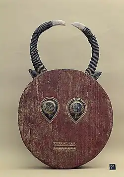 One variation of the goli mask, are the kple kple masks, also known as kouassi gbe. Despite being related to the goli masks, they're not to the same level of significance; they are rather seen as mundane by the Baoulé peoples. The kple kple masks are seen as the offspring of the goli masks and are often worn by children as a means of entertaining themselves.[4] They are rarely, if not never, used within the traditional goli performance. They are, however, still used in more playful and frivolous acts of dance. In appearance. they can have slight variations, but generally are in the shape of a circle or ellipse.[4] They often consist of a main solid color, usually red or black, along with accents of other accompanying colors. The top portion sprouts rounding horns, and the face includes eyes, which can vary in shape, and a rectangular mouth that allows the wearer to see through. The back is draped in red netting and vegetable fibers, which conceals the majority of the wearer.[4]
