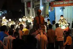 Baraat (Hindi: बरात, Urdu: بارات) (ⓘ) or Varayatra (Sanskrit: वरयात्रा, romanized: Varayātrā)[1][2] is a groom's wedding procession in the Indian subcontinent.[3][4] In North India, it is customary for the bridegroom to travel to the wedding venue (often the bride's house) on a mare (or vintage car nowadays and chariots or elephants in the past),[5] accompanied by his family members.[3][6]