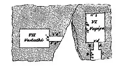 Karan Chaupar, also known as Karna Chaupar, is on the northern side of the Barabar granite hill. It consists of a single rectangular room with polished surfaces, 10.2 x 4.27m. An inscription by Ashoka dating from the 19th year of his reign, about 250 BCE, is located outside and immediately to the right of the entrance.[19] Initially, it was thought from E. Hultzsch's 1925 translation that Ashoka's inscription from Karna Chopar Cave does not mention the Ajivikas, and seems rather to refer to the Buddhist practice of retirement (vassavasa) during the rainy season. In addition, the inverted swastika with upward arrow at the end of the inscription (