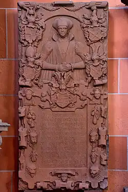 The tombstone is adorned with five coats of arms; those of Limpurg and Werdenberg are marked on the left, whereas the coats of arms of Oettinger and Baden-Sponheim occupy the right and the Wertheim-Breuberg coat of arms[17] lies above the following inscription: