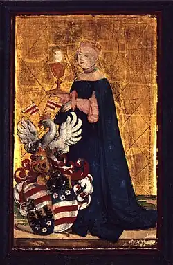 Brought up in traditional religious piety, Barbara received an education befitting a noblewoman of her era. The Schenken von Limpurg family placed great importance on education, and employed academic staff who encouraged this.[3] In line with the motto of the time "learn to serve in order to rule",[4] her tutelage prepared her for a secular role, which involved marrying an imperial count in addition to running the household, raising children according to their status, and representing the master of the house during his abesence.[5]