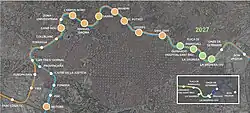 Originally expected to be completed by 2008, ongoing problems with construction delayed its expected completion until as late as 2013–2014. It was subsequently further delayed to 2016.[8] All tunneling work was stopped in 2011 due to a lack of funding, a decision taken by the Government of Catalonia in the aftermath of the 2008 financial crisis.[9] As works wouldn't be resumed for more than a decade, all opening estimates would be discarded. 4.5 km of the line's central trunk still remained to be tunneled under upper Barcelona.