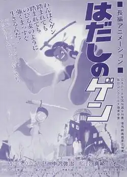 Barefoot Gen (はだしのゲン, Hadashi no Gen) is a 1983 Japanese adult animated war drama film loosely based on the Japanese manga series of the same name by Keiji Nakazawa. Directed by Mori Masaki and starring Issei Miyazaki, Masaki Kōda and Tatsuya Jo, it depicts World War II in Japan from a child's point of view revolving around the events surrounding the bombing of Hiroshima and the main character's firsthand experience of the bomb.