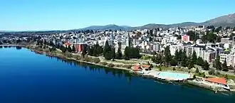 San Carlos de Bariloche (from the Mapuche name Vuriloche, meaning "people from the other side of the mountain"), commonly known simply as Bariloche (Spanish pronunciation: [baɾiˈlotʃe]), is the largest city in the Argentine province of Río Negro and the seat of the department of the same name. It is located in the foothills of the Patagonian Andes on the southern shore of Nahuel Huapi Lake, near the border with Chile.[3] With a population of 135,755 according to the 2022 census,[4] Bariloche is a mid-sized city by national standards but holds significant regional importance,[3] being not only the most populous city in its province but also the largest in the Patagonian Andes,[1] and the third largest in the entire Argentine Patagonia following Neuquén and Comodoro Rivadavia. Its urban zone is characterized by its low density and has an area of more than 220 square kilometres (85 sq mi), extending longitudinally from east to west for about 50 kilometres (31 mi).[3]