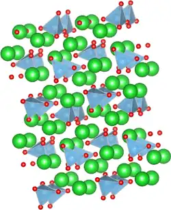 The solid has two known phases: a low-temperature (β) phase with P21/n symmetry[1] and a high-temperature (α′) phase with P21nb symmetry.[2] The structure of Ba2TiO4 is unusual among the titanates because its titanium atoms sit in a four-oxygen tetrahedron rather than a six-oxygen octahedron.[1][3]