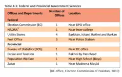 A number of Federal and Provincial Government departments provide services at the district level. Except for FBS, Civil Defense and Passport and immigration, all other major departments are functional at the district level, and some departments have offices even at the tehsil level. (DC office, Election Commission of Pakistan, 2010)