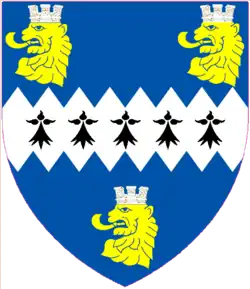 Azure, a Fess indented Ermine, between three Lions' Heads erased Or, murally crowned Argent