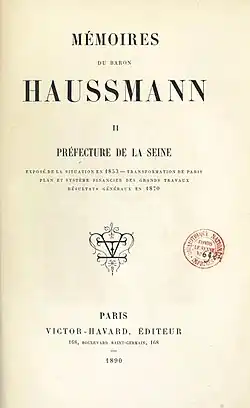 - ^ (in French) Baron Haussmann, Mémoires, trois tomes publiés en 1890 et 1893. Nouvelle édition établie par Françoise Choay, Seuil, 2000. See also l'exemplaire de Gallica.