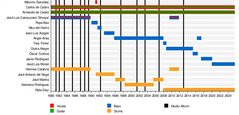 The original lineup of Barón Rojo consisted of brothers Armando and Carlos De Castro, both guitarists, who had just left the hard rock band Coz. José Luis Campuzano, nicknamed "Sherpa", who came from the prog rock band Módulos, joined them as bassist and vocalist. They eventually added Uruguayan drummer Hermes Calabria, who after touring Spain with his prog rock band Psiglo decided to stay in the country.[3] Songwriting duties were divided between the de Castro brothers and "Sherpa" and his wife Carolina Cortés (who wrote the lyrics for his songs).[4] This lineup remained stable until 1989.