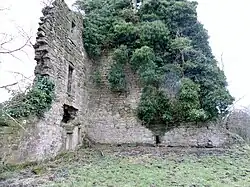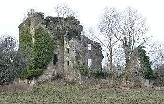 This wing was constructed in 1627 at right angles to the old keep using rubble faced with dressed with sandstone ashlar.[22] A door was broken through from the hall of the old keep to a staircase in the mansion house. The mansion was a fine specimen of 17th-century architecture.[18] It had turrets corbelled out at hall level and these contained closets. The front door was set in an unusual shallow projection and a narrow back door at the north facing aspect led into a courtyard. Two cellars existed with a passage between them that connected with the main staircase.[17] The hall in the old tower may have been used as a dining area and the large room in the mansion house utilised as a drawing-room.[18] The most southerly turret and a large part of mansion house wing fell at some point between 1956 and 1964.[23]