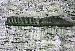 The Puritans acted against images of the Virgin Mary however a widespread use of her name or more usually initials continued.[21] The Gothic script and positioning on the stone suggests that a secondary use from a tomb and this would be seen as doubly potent if it was once housed within the nearby Kilwinning Abbey as it would be seen to have been infused with holy energies.