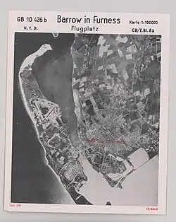 During the Second World War, Walney Island was home to two of the country's many coastal artillery installations (Hilpsford Fort and Fort Walney), and numerous pillboxes can to this day be found littered across the Walney coastline. They were used as lookouts and contained rifles and light machine guns that could be used to defend Barrow against the Luftwaffe.[4] The entrance to a large underground air-raid shelter that was used by shipyard workers can be found in the car park of the Waterfront Barrow-in-Furness development.[5] A large unit of the Royal Air Force was based at Barrow/Walney Island Airport which was expanded during the war in an effort to aid Britain's air defences.[6]