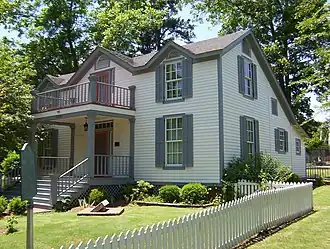 The Nicholas Gotten House is located at 2969 Court Street. It houses the Bartlett Museum, a local history museum operated by the Bartlett Historical Society.[15] The white frame structure was built by Nicholas Gotten in 1871 in the New England saltbox style.[16] A saltbox is a wooden frame house with a long, pitched roof that slopes down to the back.