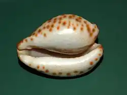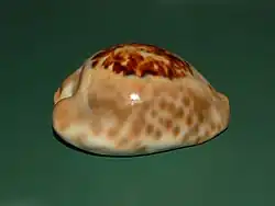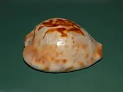 | A shell of Barycypraea teulerei, dorsal view, anterior end towards the right | |
