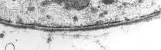 ![]() Transmission electron micrograph displaying basal lamina that is lining the external surface of cell membrane. | |