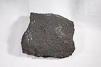 Basaltic andesite is a fine-grained (aphanitic) igneous rock that is moderately low in silica and low in alkali metal oxides. It is not separately defined in the QAPF classification, which is based on the relative percentages of quartz, alkali feldspar, plagioclase feldspar, and feldspathoids, but would fall in the basalt-andesite field.[3] This corresponds to rock in which feldspathoid makes up less than 10% and quartz less than 20% of the total QAPF fraction, and in which at least 65% of the feldspar is plagioclase.[4] Basaltic andesite would be further distinguished from basalt and andesite by a silica content between 52% and 57%.[5]