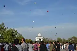 Historically, Maharaja Ranjit Singh held an annual Basant fair and introduced kite flying as a regular feature of the fairs held during the 19th[3] century which included holding fairs at Sufi shrines.[4] Maharaja Ranjit Singh and his queen Moran would dress in yellow and fly kites on Basant.[5] The association of kite flying with Basant soon became a Punjabi tradition with the centre in Lahore which remains the regional hub of the festival throughout the Punjab region.[6] Indeed, Maharaja Ranjit Singh held a darbar or court in Lahore on Basant which lasted ten days. During this time soldiers would dress in yellow and show their military prowess.[7] Other traditions of the Basant in Lahore included women swaying on swings and singing.[8]