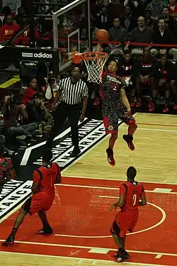 The behind-the-back dribble consists of moving the ball from one hand to the other hand by bouncing it behind one's back. This dribble is frequently used when a basic crossover dribble could be stolen.[1] This dribble is especially useful when the offensive player is close to a defender and needs to switch the ball to the opposite hand, but does not have room to use a regular crossover.[4]