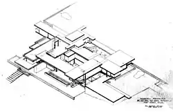 The home is built around a steel frame which is covered by glass and aluminum. The design draws from those of Frank Lloyd Wright and Ludwig Mies van der Rohe. It reflects a minimalist approach and straight lines. There are no curves in the home.[2][5] The house features cantilevered horizontal shapes overlapping each other surrounding a courtyard. Inside there are four floors which have 12 level changes and there are 14 separate ceiling heights.[1] It is said to resemble Frank Lloyd Wright's Fallingwater design.[6] The building's design constructs an illusion of levitating horizontal planes: vertical planes are disguised by the cantilevered planes.[4]