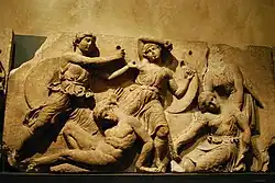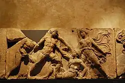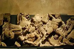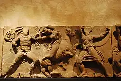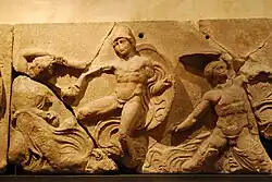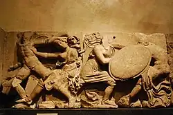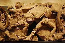 The first four slabs of the frieze, from the northwest corner to the middle of the west side, depict the attack on the Greeks at Troy by Amazons under Penthesilea BM 538, BM 532, BM 537, and BM 539 The battle itself spans three blocks, culminating in the death of Penthesilea at the hands of Achilles on BM 537, while the fourth slab, BM 539, depicts a truce at the end of the battle. In the first pair of combatants, on slab BM 538, an Amazon has gained the upper hand over her opponent, but with the second pair the situation is dramatically reversed. Here a bearded Greek, wearing a chiton, a cuirass, a helmet, and a baldric and carrying a shield, seizes an Amazon by the hair while trampling her underfoot. He is the most heavily armed soldier in either of the Amazonomachies depicted, and the only bearded Greek, so far as we can tell, anywhere on the frieze. On the second slab, BM 532, one Amazon uses a hoplite shield to guard a second kneeling Amazon who has just shot an arrow[20] The battle reaches its climax on the third slab, BM 537, where Achilles slays the Amazonian queen. Achilles and Penthesilea[21] appear in the center of the slab, while a single Greek and a single Amazon flank them. The final slab in the series, BM 539, represents the moment when a truce has been called between the Greeks and Amazons in order to clear the battlefield of equipment, the wounded and the dead.