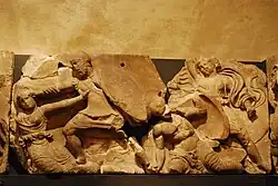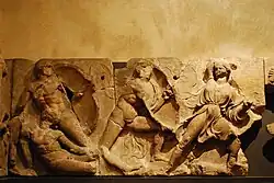 Archaeological research has determined that the site of the present ruin of the temple of Apollo was in continuous use since the archaic period,[1] the existing temple is the last of four on the site and designated Apollo IV. Pausanias[2] records that this last sanctuary was dedicated to Apollo Epikourios (helper or succourer) by the Phigalians in thanks for delivery from the plague of 429 BC.[3] The architecture of the temple is one of the most strikingly unusual examples of the period, departing significantly from the norms of Doric and Ionic practice and including what is perhaps the first use of the Corinthian order and the first temple to have a continuous frieze around the interior of the naos. From the style of the frieze it belongs to the High Classical period, probably carved around 400 BC. Nothing is known of its authorship: despite an ascription of the metopes to Paionios[4] (since refuted[5]), the frieze cannot be associated with any sculptor, workshop or school. Instead Cooper identifies the artists of the frieze on morellian evidence as a group of three anonymous masters.[6]