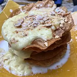 In the traditional Fassi cuisine, pastilla can also be served as a dessert, in which case, the pastilla is called Jowhara (جوهرة, jewel) or "Pastilla with milk". This pastilla is also made of warka and a milky cream put between the sheets. The Jowhara is flavored with orange flower water and decorated with cinnamon and sugar.[21]
