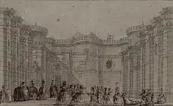 During the 1550s, Henry II became concerned about the possibility of an attack on Paris by England or the Holy Roman Empire, and strengthened the defences of the Bastille in response.[35] The southern gateway into the Bastille became the principal entrance to the castle in 1553, the other three gateways being closed.[22] A bastion, a large earthwork projecting eastwards from the Bastille, was built to provide additional protective fire for the Bastille and the Arsenal; the bastion was reached from the fortress across a stone abutment using a connecting drawbridge that was installed in the Bastille's Comté tower.[36] In 1573 the Porte Saint-Antoine was also altered – the drawbridges were replaced with a fixed bridge, and the medieval gatehouse was replaced with a triumphal arch.[37]