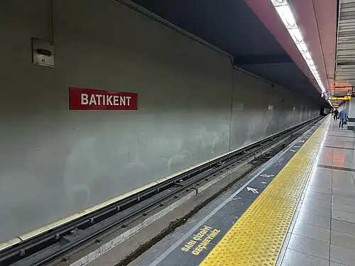 Batıkent is an underground rapid transit station of the Ankara Metro. It is located along Başkent Avenue at the intersection with 1777th Avenue. The station was originally opened as the western terminus of the M1 line on 29 December 1997.[1] On 13 February 2014, it became the eastern terminus of the M3 line.[2] Both lines use the same platform as the M3 is an extension of the M1.