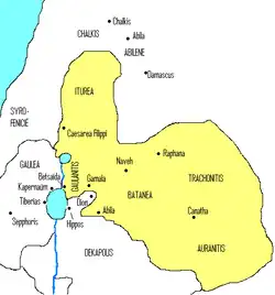 In the 1st century BCE, the land was acquired by Herod the Great, who established a community of Jews from Babylon who were brought to Batanaea for the purpose of maintaining order against the banditry of the Trachonites.[2] Upon Herod's death in 4 BCE, Batanaea passed to his son Philip as part of his inheritance. In some sources, Philip is referred to as the "Tetrarch of Batanea" with the capital at Caesarea Philippi, although his lands were more extensive than this.