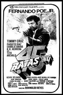 Batas ng .45 (lit.โ'Law of the .45') is a 1991 Filipino action film directed by Fernando Poe Jr. (under the pseudonym Ronwaldo Reyes) who also stars in the film along with Timmy Cruz, Paquito Diaz, Charlie Davao, R.R. Herrera, and Tito Arevalo. The film was produced and released by Chiba Far East Film International on May 30, 1991.