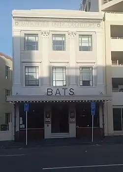 The BATS Theatre Company was founded in 1976 by Rodney Bane and David Austin. BATS is an acronym of "Bane Austin Touring Society".[1][2] Initial plans were to tour one-act plays in Wairarapa, Manawatu and Wellington.[3] Bane and Austin took over the current building at 1 Kent Terrace in the late 1970s and the building was renamed BATS Theatre in 1979.[4][5]
