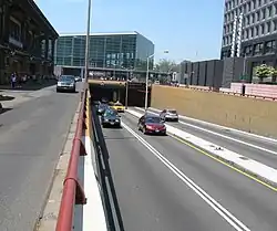 The Battery Park Underpass is a vehicular tunnel at the southernmost tip of Manhattan, New York City, near the neighborhoods of South Ferry and Battery Park City. The tunnel connects FDR Drive, which runs along the east side of Manhattan Island, with the West Side Highway (New York State Route 9A, or NY 9A), which runs along the island's west side. Opened in 1951, it was the second section of FDR Drive to be completed. The underpass crosses beneath the Battery (formerly Battery Park) and the approach to the Brooklyn–Battery Tunnel.