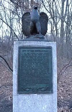The Dongan Oak Monument with its bronze eagle atop a stele was dedicated on Evacuation Day 1922,[24] designed by Frederick Ruckstull and sponsored by the Saint Nicholas Society of the City of New York. The local "Battle Pass Chapter" of the Daughters of the American Revolution dedicated another boulder marker in 1929.[25] The eagle of the Dongan Oak Monument was stolen in the 1970s, and again in the 1990s, and has been replaced both times by the Prospect Park Alliance.[26] The area around the monument has been vulnerable to flooding and was repaired in the 2010s.[27]