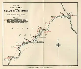 Kitchener's expedition embarked in March 1896, leaving Egypt behind and entering Mahdist Sudan later that month.[14] His column advanced along the Nile, using the river for resupply and communication, while laying track around the unnavigable sections.[15] However, the expedition could not proceed in this fashion all the way to Omdurman. The river travels far south to Ed Debba before bending steeply to the north-east up to Abu Hamed, where it pivots once more to the south and winds on past Khartoum. The section of the river from Merowe to Abu Hamed is made unnavigable by continuous cataracts, and the ground along its banks is unsuitable for railroads. These conditions did not render the approach impossible, only difficult, dangerous, and slow.[13] Kitchener sought an alternative route, and settled on one widely thought to be infeasible: he determined to build a railway across the vast, dry, and scorching Nubian Desert that would connect Wadi Halfa to Abu Hamed, a small town then under Mahdist control. Premier engineers in Britain deemed the railroad an impossibility for several reasons, foremost of which being the speculated lack of available water sources along 120 miles of the proposed 230 mile line.[16] Kitchener disregarded this impediment and all others, ordering the well-known Lieutenant Percy Girouard to make preparations to begin construction. The capable engineer conducted extensive surveys of the proposed line, and found that, although the terrain was certainly difficult, and water fearfully sparse, the line was possible. The decision was made in December 1896, and work on the railway officially begun 1 January 1897.[17]