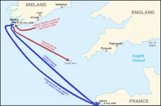 The newly appointed commander-in-chief of the English main fleet, Arthur Herbert, did not go to sea until the beginning of April, leaving behind a number of ships which had mutinied for overdue pay.[9] Herbert's fleet of 19 ships sailed on 4 April; it was off Cork by 12 April, seeking to intercept enemy vessels. The French fleet, consisting of 24 third- and fourth-rate vessels, two frigates, a number of fireships, and transports carrying weapons and supplies for James’s campaign, left the port of Brest on 6 May.[2]