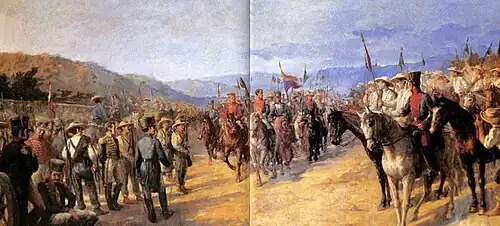The Battle of Boyacá (1819), also known as the Battle of Boyacá Bridge was a decisive victory by a combined army of Venezuelan and New Granadan troops along with a British Legion led by General Simon Bolivar over the III Division of the Spanish Expeditionary Army of Costa Firme commanded by Spanish Colonel José Barreiro. This victory ensured the success of Bolívar's campaign to liberate New Granada. The battle of Boyaca is considered the beginning of the independence of the north of South America, and is considered important because it led to the victories of the battle of Carabobo in Venezuela, Pichincha in Ecuador, and Junín and Ayacucho in Peru.[1] New Granada acquired its definitive independence from the Spanish Monarchy, although fighting with royalist forces would continue for years.[2]: 232–235