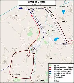 The Battle of Csorna, fought on 13 June 1849, was one of the battles which took place in the Summer Campaign of the Hungarian War of Independence from 1848 to 1849, fought between the Habsburg Empire and the Hungarian Revolutionary Army. The Hungarian army was led by Colonel[2] György Kmety, and the imperial army by Major General Franz Wyss. After liberation of the Hungarian capitals from the siege of Buda, the Hungarian commanders elaborated a plan to continue the Hungarian advance towards the Habsburg capital Vienna, before the arrival of the 200,000-strong army, sent by the Russian Empire to help the 170,000-strong Habsburg troops to crush the Hungarian revolution and freedom. But before the real fighting started between the two main armies, the commander of the 15th division of the VII Hungarian army corps, Colonel György Kmety, attacked the imperial half brigade led by Franz Wyss by surprise, and in heavy fighting forced them to flee. During the retreat the imperial commander also received a fatal wound, dying on the battlefield. At the same time two other Hungarian detachments from the VII corps also won victories against Austrian troops, chasing them away from Öttevény and Kóny.