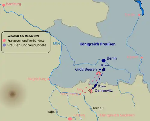 The Battle of Dennewitz (German: Schlacht von Dennewitz[c]) took place on 6 September 1813 between French forces commanded by Marshal Michel Ney and the Sixth Coalition's Allied Army of the North commanded by Crown Prince Charles John of Sweden, Friedrich Wilhelm von Bülow and Bogislav von Tauentzien. It occurred in Dennewitz, a village in the Prussian province of Brandenburg, near Jüterbog, 40 kilometres (25 mi) southwest of Berlin. The battle marked a turning point in the German Campaign of 1813 as not only did the Allied victory end Napoleon's hopes of capturing Berlin and knocking Prussia out of the war, but the severity of the French defeat, inflicted by a primarily Prussian force, also led to the erosion of fidelity of German allies to the Napoleonic cause.[9] The French losses, and consequent diplomatic reverses, that resulted from Dennewitz contributed greatly to Napoleon's defeat a month later at the Battle of Leipzig.