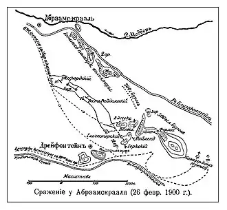 The Boer forces under the command of Christiaan de Wet were holding a 7-mile (11 km) line covering the approach to Bloemfontein. Lord Roberts subsequently ordered a division under Lieutenant General Thomas Kelly-Kenny to attack the position from the front, while Lieutenant General Charles Tucker's division moved against its left flank.[3] The Boers were subsequently forced to withdraw losing 124 men killed and captured, while the British lost 82 killed and 342 wounded.[2][4][5]