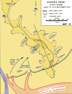 - ^ Alexander, p. 138; Christ, pp. 193–194; Frank, Guadalcanal, pp. 223, 225–226; Griffith, Battle for Guadalcanal, pp. 132, 134–135; Jersey, Hell's Islands, p. 223; and Smith, Bloody Ridge, pp. 130–131, 138. Edson's unit comprised about 600 Raiders and 214 Paramarines. Edson had personally scouted the ridge a week before the Tasimboko raid and told his assistant, "This is the place. This is where they'll hit" (Alexander, p. 141).