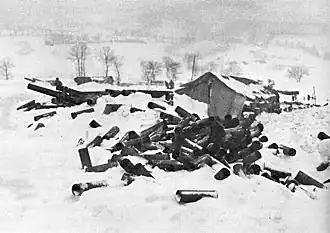 ![]() Discarded artillery shell casings litter a U.S. artillery position on Elsenborn Ridge. | |||||||