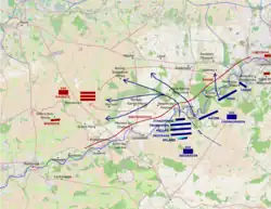 At this time Prince Coburg warned his wing commander that the main army was moving in the direction of Tournai and that Kaunitz must act strictly on the defensive.[14] On 18 May 1794, Coburg and his 74,000-strong army were defeated in the Battle of Tourcoing by the 82,000-man left wing of the Army of the North, led by Souham in the absence of Pichegru. This was followed on 22 May by the Battle of Tournay in which Coburg defeated Pichegru's attacks.[15] Kaunitz deployed an outpost line along the north bank of the Sambre with Prince Heinrich XV of Reuss-Plauen in charge of the left and Paul Davidovich directing the right. Aware of the large numerical superiority of the French, the Austrian wing commander issued orders to be carried out in case a retreat was necessary.[14]