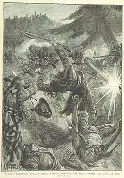 The two sides exchanged gunfire for three hours. Cree rifle fire wounded some of the soldiers in the valley, while Strange's artillery put holes in the hillside, damaging the trenches where Cree sheltered.