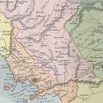 After leaving Ager Falernus through the pass of Callifae, Hannibal retraced his steps, moving east towards Molise. The Carthaginian army, encumbered with plunder and herds of cattle, moved slowly, seeking a place to set up their winter quarters. Fabius and the Romans dogged the Carthaginians from a distance and avoided confrontation with them. Hannibal marched north to Venefram, which caused alarm in Rome as the city was thought to be the Carthaginian objective. The Carthaginian army then turned east into Samnium, and after crossing the Apennine Mountains and moving through the Pelignial plains, finally entered Molise. Fabius continued to follow Hannibal, and when the Carthaginians reached Geronimom (near the modern-day village of Casacalenda) and took over the town, Fabius set up his camp at Larinum, 20 miles to the south.[1]