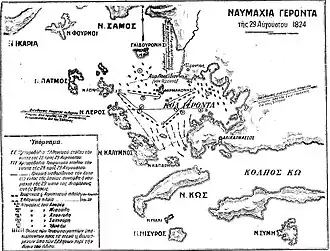 The Battle of Gerontas (Greek: Ναυμαχία του Γέροντα) was a naval battle fought close to the island of Leros in the southeast Aegean Sea. On 10 September [O.S. 29 August] 1824, a Greek fleet of 75 ships defeated an Ottoman armada of 100 ships[4] contributed by Egypt, Tunisia and Tripoli.