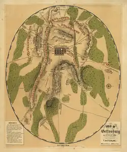 The Union line ran from Culp's Hill southeast of the town, northwest to Cemetery Hill just south of town, then south for nearly two miles (3 km) along Cemetery Ridge, terminating just north of Little Round Top.[57] Most of the XII Corps was on Culp's Hill; the remnants of I and XI Corps defended Cemetery Hill; II Corps covered most of the northern half of Cemetery Ridge; and III Corps was ordered to take up a position to its flank. The shape of the Union line is popularly described as a "fishhook" formation.[58]
